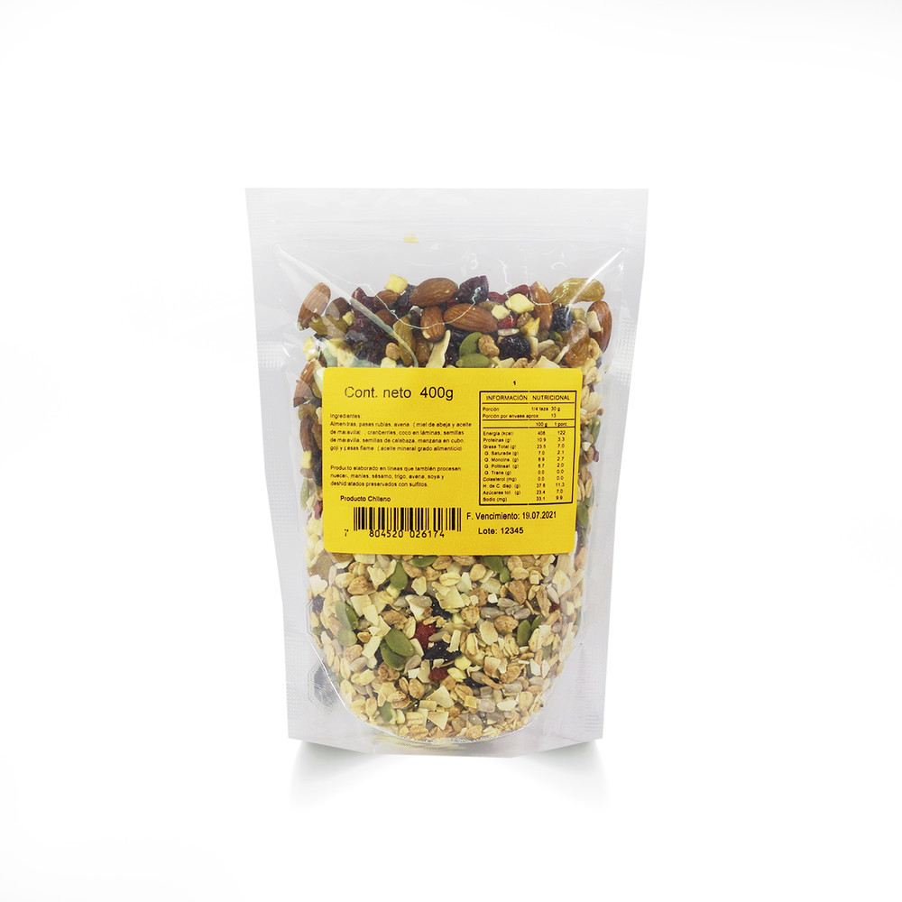 Ingredientes: Pasa rubias, almendras tostadas, cranberries, avena integral (sucralosa), semillas de maravilla, semillas de calabaza, manzana en cubo, goji, y pasas flame.